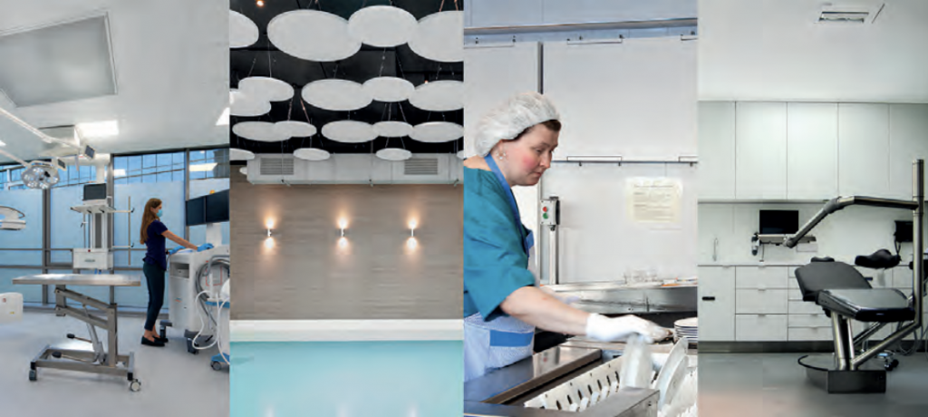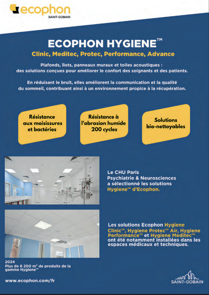 Développée pour répondre aux normes les plus exigentes tout en optimisant l’acoustique, la gamme Hygiene o¿re une solution idéale pour vos projets. Composée de plafonds modulaires, panneaux muraux, îlots et toiles tendues, elle s’adpate parfaitement aux environnements nécessitant des exigences strictes en matière d’hygiène et de confort sonore. Domaines d’activités : établissements de santé, laboratoires, établissements scolaires, industries et tertiaire.